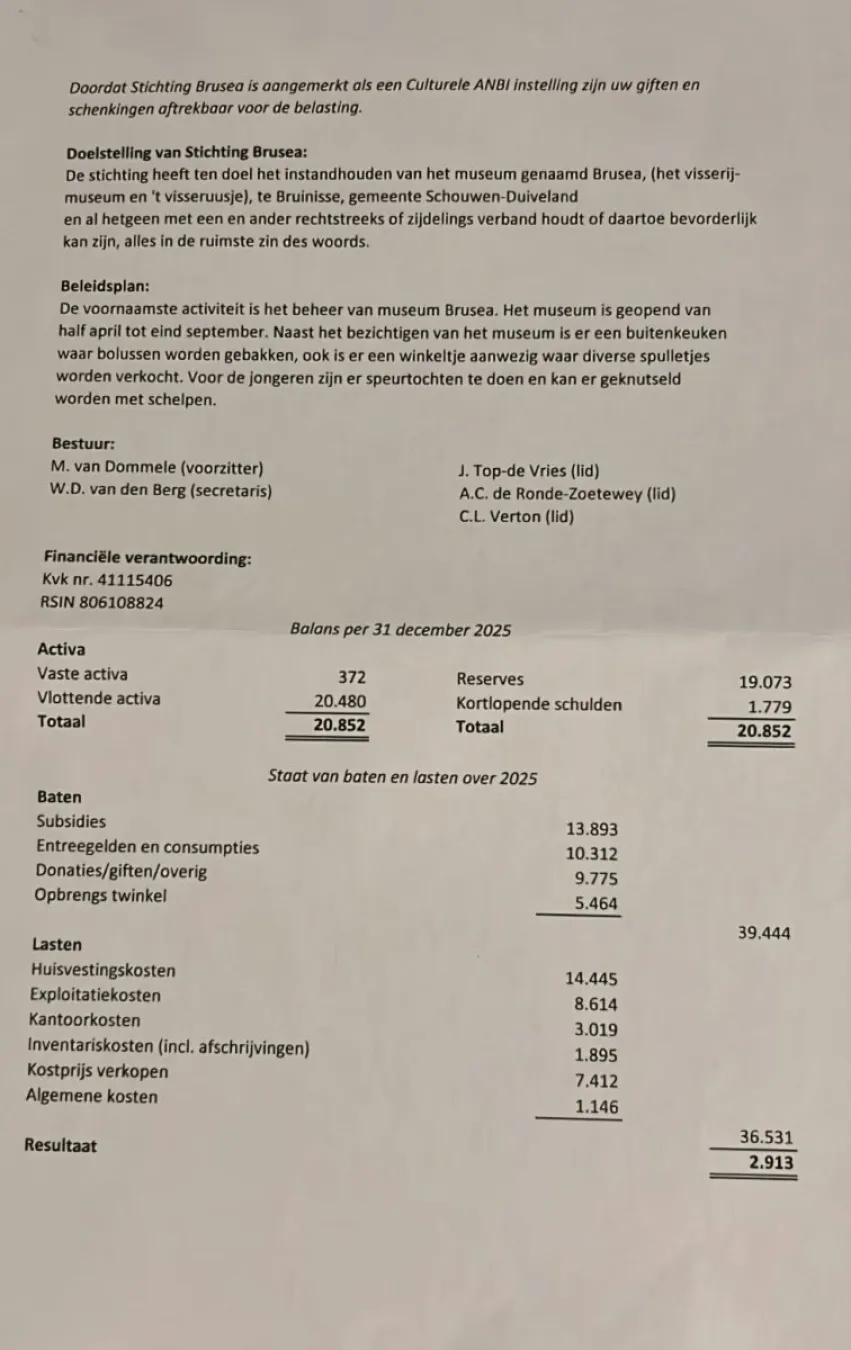 Brusea is door de Belastingdienst aangemerkt als een Algemeen Nut Beogende Instelling (ANBI). Dit betekent dat uw giften, donaties of legaten aan ons museum onder bepaalde voorwaarden fiscaal aftrekbaar zijn. Hiermee steunt u niet alleen het behoud van de Bruse historie, maar geniet u ook van belastingvoordeel. Als culturele instelling zetten wij deze middelen volledig in voor het beheer en behoud van ons erfgoed.